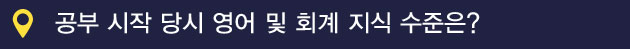 영어는 어린 시절 유학과 국내 대학으로 비추어 봤을 때 전체 반 평균 기준 중~중상 정도였을 거라고 생각합니다. 영어를 엄청 잘하지 않았음에도 공부하는데 전혀 무리가 없어서 영어 실력은 정말 별로 중요하지 않은 것 같습니다. 회계 지식은 공인회계사 공부를 2년간 했던 경험이 있어 중상~상이었다고 생각합니다.